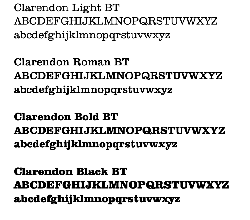 The primary display typeface is Clarendon BT. Clarendon is a slab serif typeface. Its curvy lines are a nice contrast to sans serif typefaces and are a powerful choice for graphic typography. Display type refers to the use of type at large sizes.
