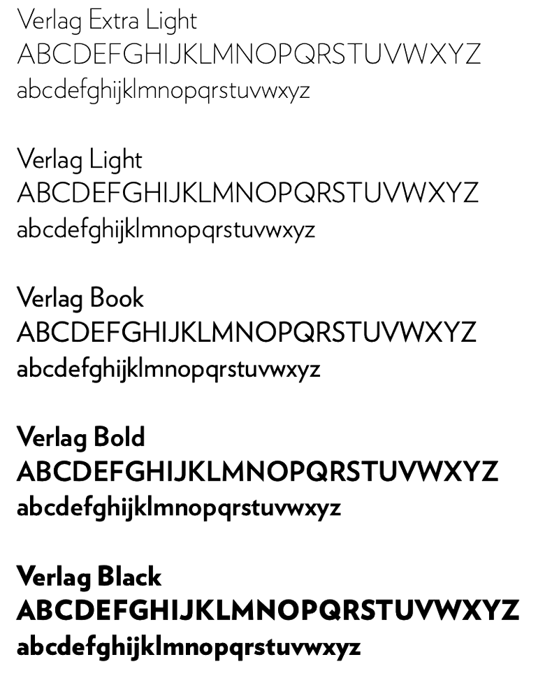 The primary typeface for headline, subheads and callouts is Verlag. It can also be used as a display typeface. Verlag is a typeface based on Futura and other geometric type styles.